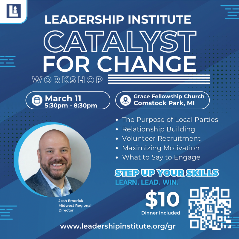 The Kent County GOP is excited to promote the Leadership Institute’s Catalyst for Change: Precinct Leadership Workshop, coming to Comstock Park!
