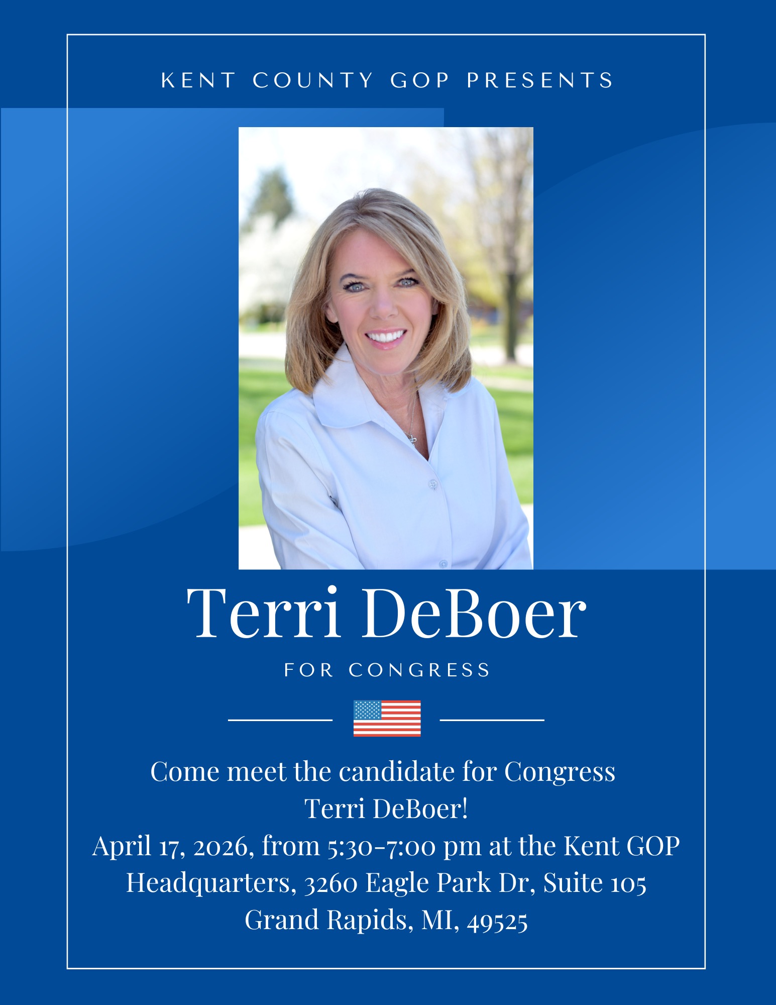 Come meet candidate for Congress Terri DeBoer! Terri is a former meteorologist who is forecasting a brighter future for Michigan. The 3rd Congressional District spans most of Kent County up to Muskegon. She'll bring high energy, good food, and plenty of petition sheets for everyone to sign! She needs YOUR help to get on the ballot, so make sure to show up at the Kent GOP Headquarters on April 17th at 5:30! See you there!